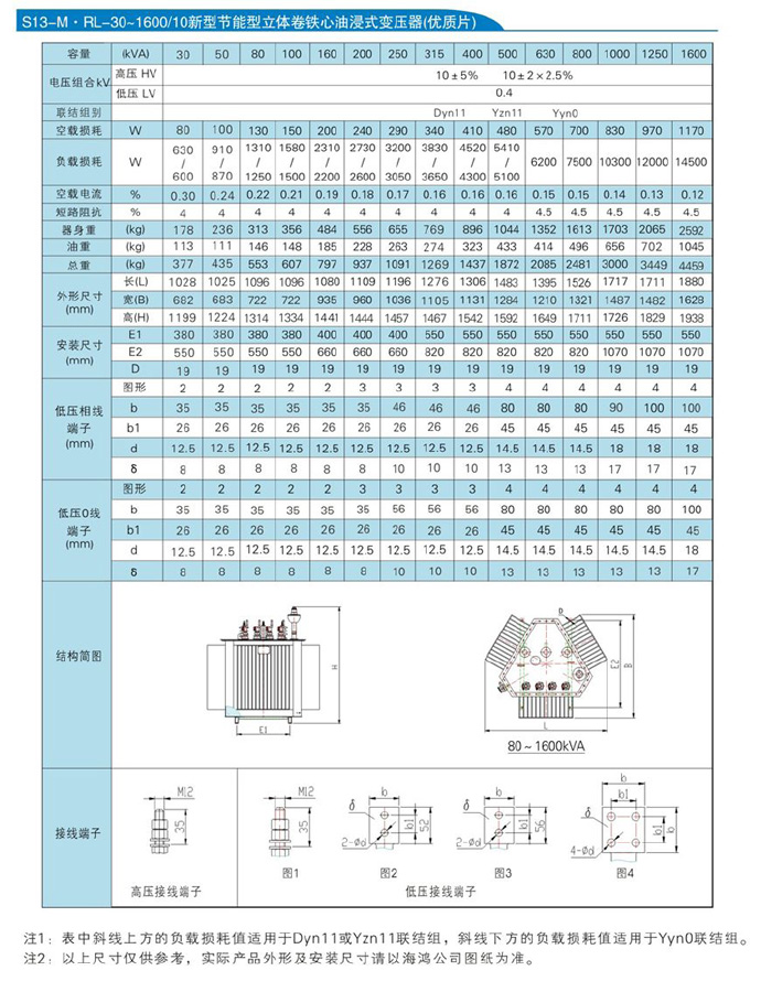 華盈S13-M.RL系列10kV 三相油浸式卷鐵芯雙繞組無勵磁調壓配電變壓器技術參數: